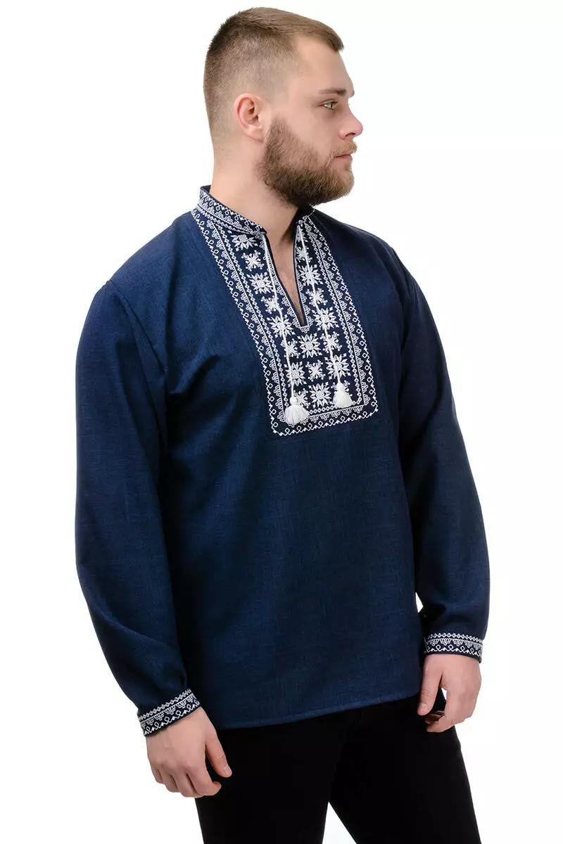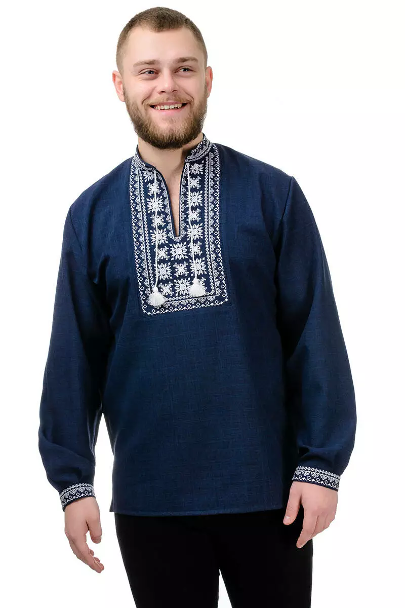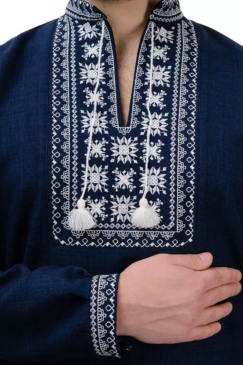 Головною окрасою й одночасно чарівною відмінністю сорочки є вишиті геометричні орнаменти. Білий візерунок довершує елегантний образ і робить виріб ще більш оригінальним. Крій сорочки вільний, рукава на манжетах і застібаються на ґудзик.