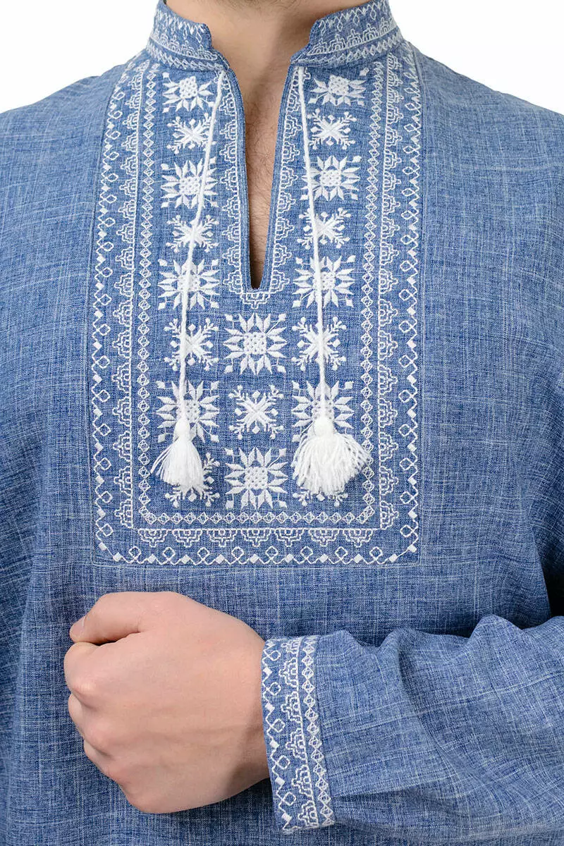 Головною окрасою й одночасно чарівною відмінністю сорочки є вишиті геометричні орнаменти. Білий візерунок довершує елегантний образ і робить виріб ще більш оригінальним. Крій сорочки вільний, рукава на манжетах і застібаються на ґудзик.