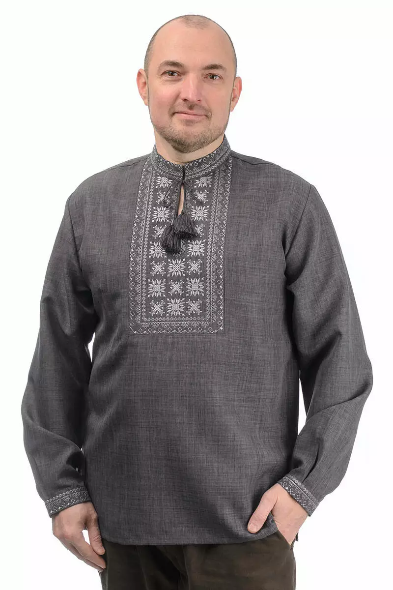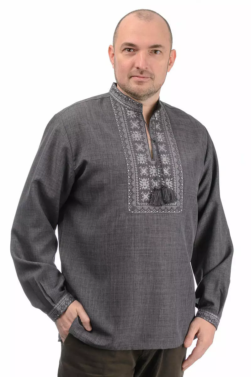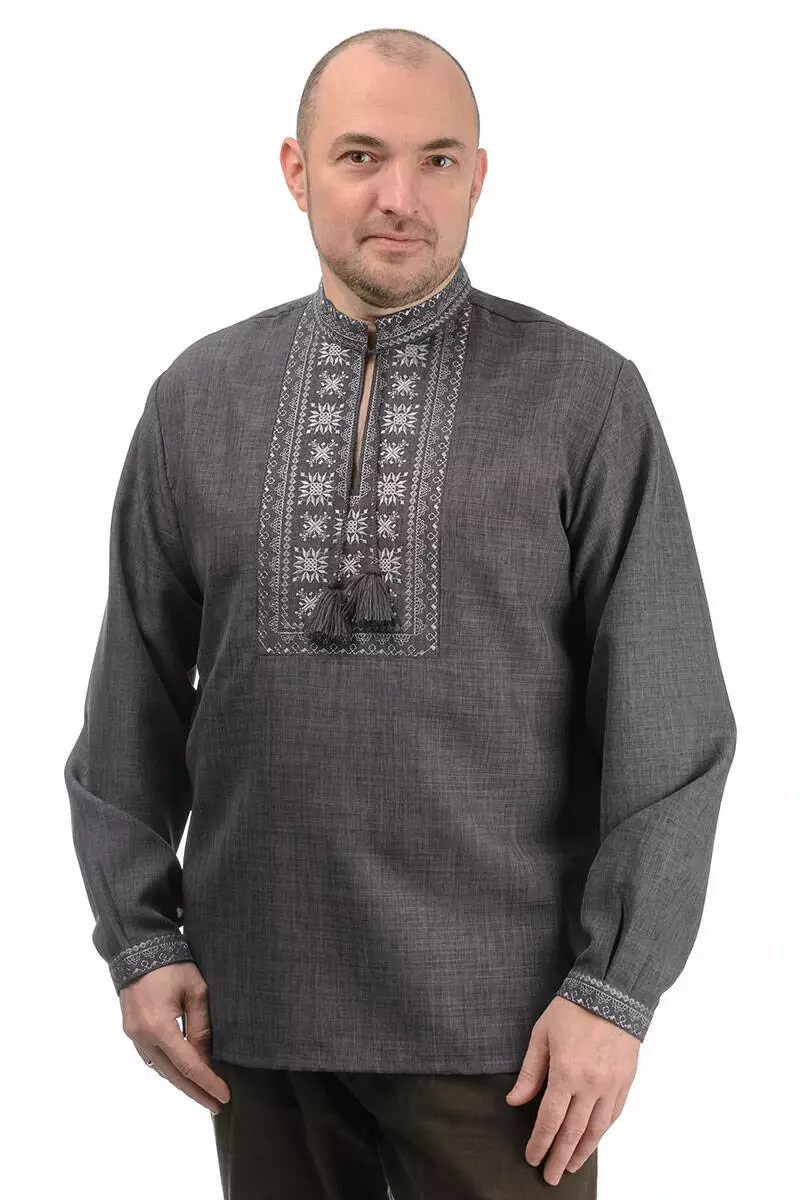 Головною окрасою й одночасно чарівною відмінністю сорочки є вишиті геометричні орнаменти. Білий візерунок довершує елегантний образ і робить виріб ще більш оригінальним. Крій сорочки вільний, рукава на манжетах і застібаються на ґудзик.