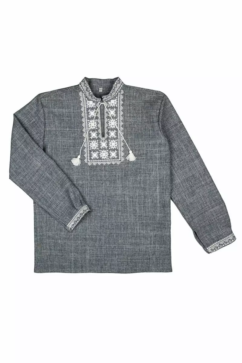 Головною окрасою й одночасно чарівною відмінністю сорочки є вишиті геометричні орнаменти. Білий візерунок довершує елегантний образ і робить виріб ще більш оригінальним. Крій сорочки вільний, рукави на манжетах і застібаються на ґудзики.