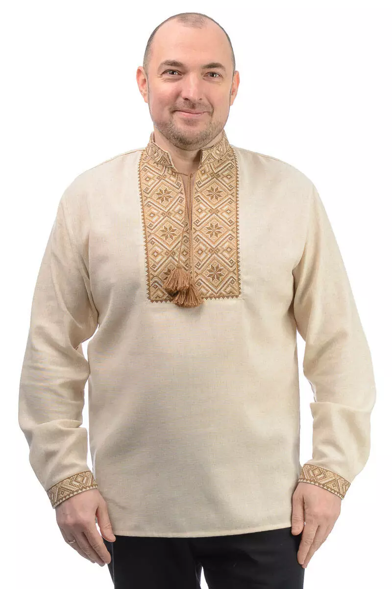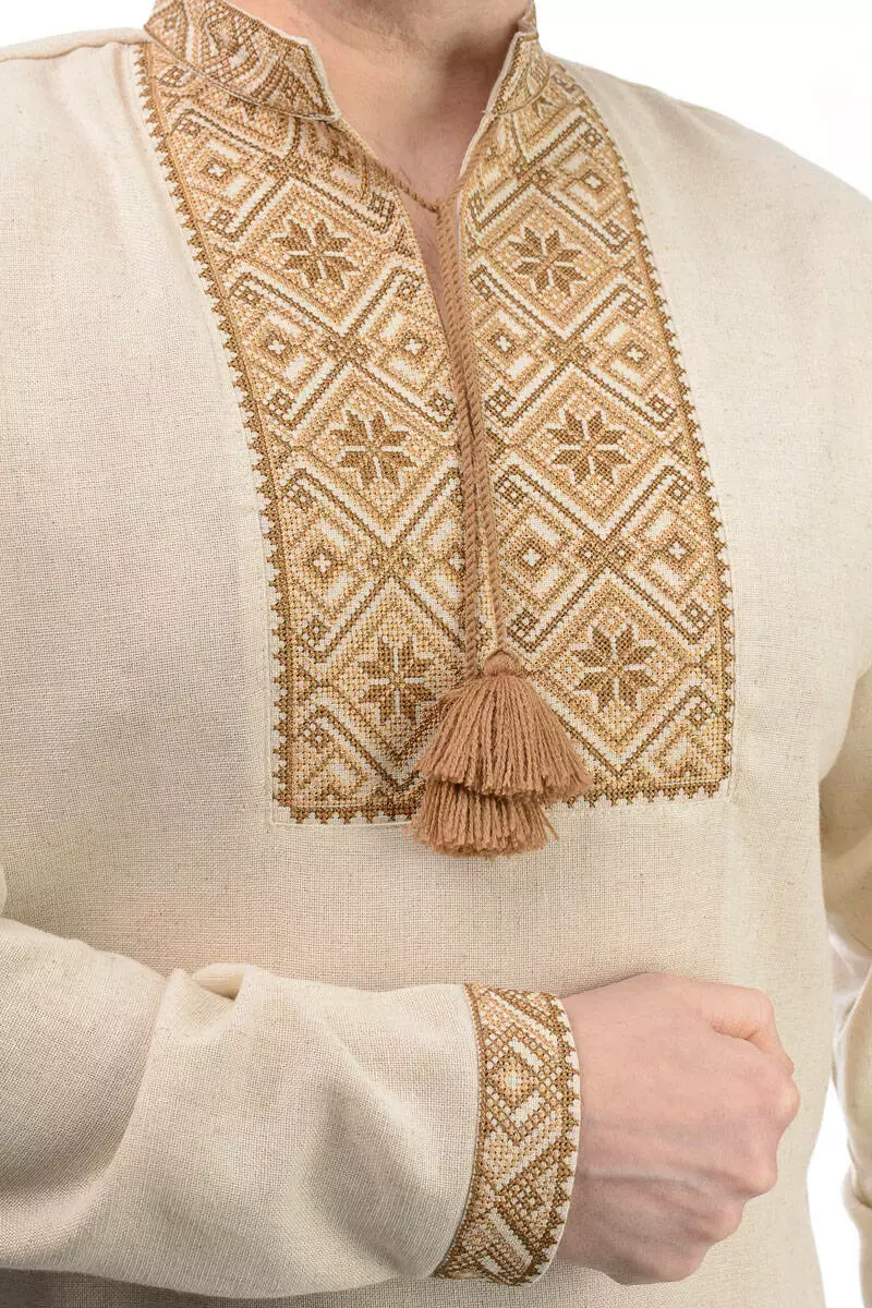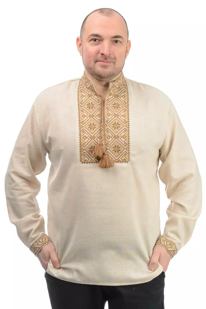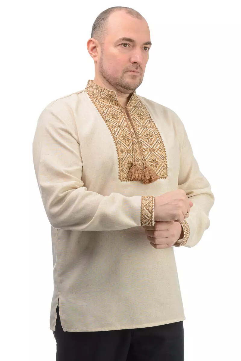 Чоловіча вишиванка в етно стилі - це одяг, що поєднує у собі традиційні елементи української вишивки з сучасними модними тенденціями. Виготовлена з лляного матеріалу і прикрашена машинною вишивкою, імітуючи стиль традиційної української вишивки.