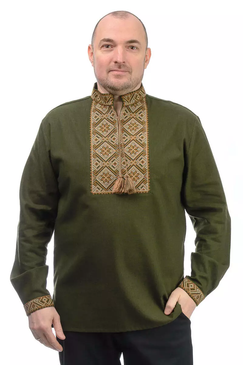 Чоловіча вишиванка в етно стилі - це одяг, що поєднує у собі традиційні елементи української вишивки з сучасними модними тенденціями. Виготовлена з лляного матеріалу і прикрашена машинною вишивкою, імітуючи стиль традиційної української вишивки.
