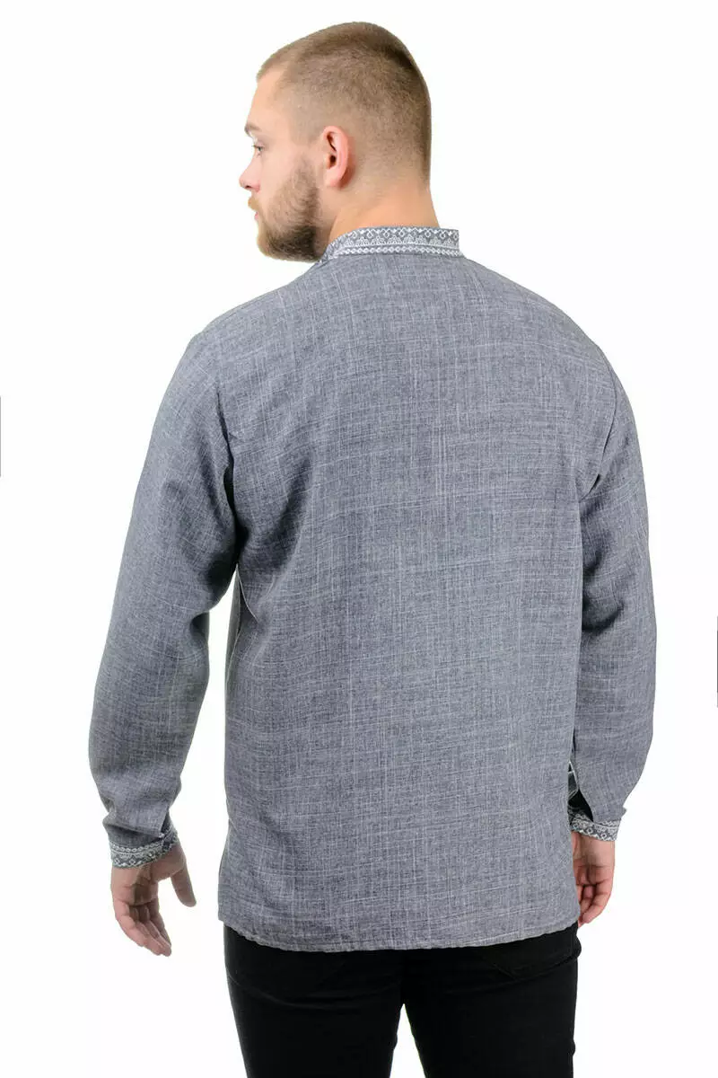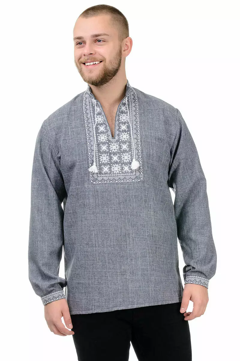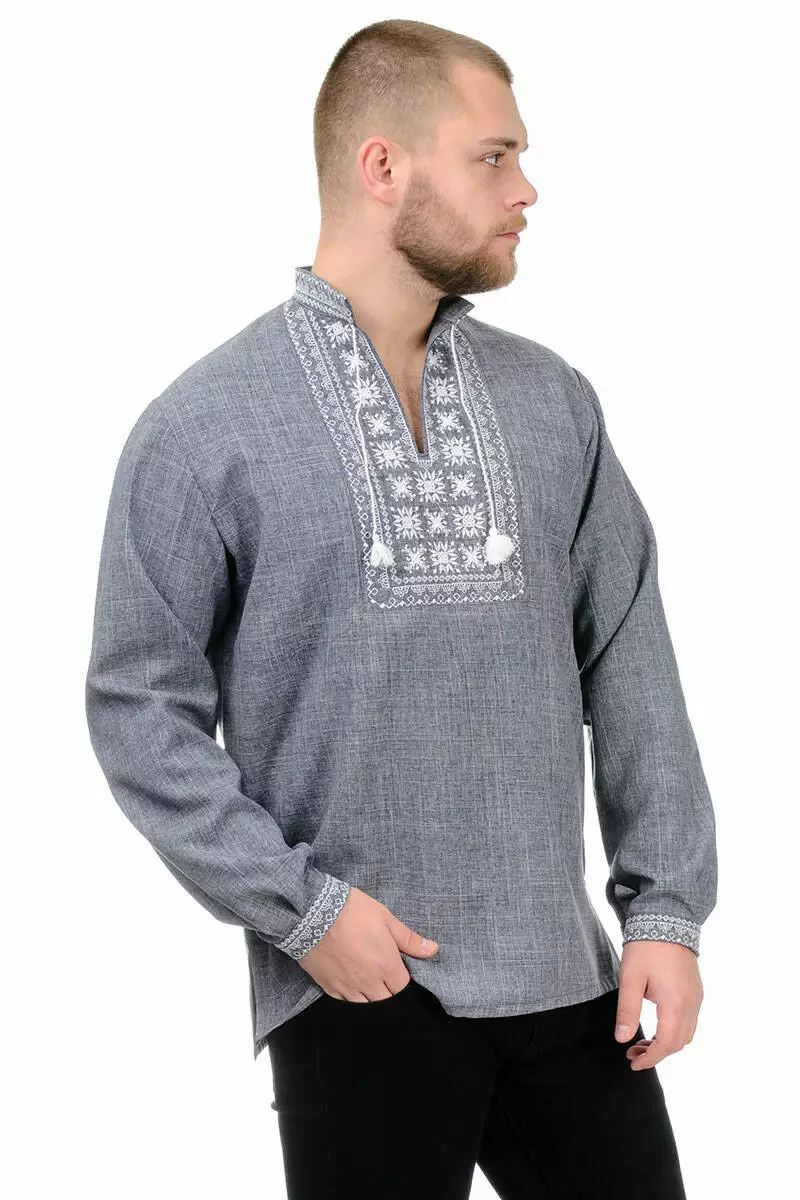 Головною окрасою й одночасно чарівною відмінністю сорочки є вишиті геометричні орнаменти. Білий візерунок довершує елегантний образ і робить виріб ще більш оригінальним. Крій сорочки вільний, рукава на манжетах і застібаються на ґудзик.