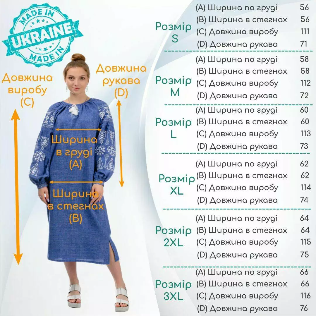 Сукня-вишиванка вироблена з якісних матеріалів. Тканина - льон-габардин щільна та приємна на дотик. Ошатні візерунки на рукавах і грудях вишиті машинним способом. Важливо, що навіть після багаторазового прання тканина і вишивка зберігають свої початкові кольори.