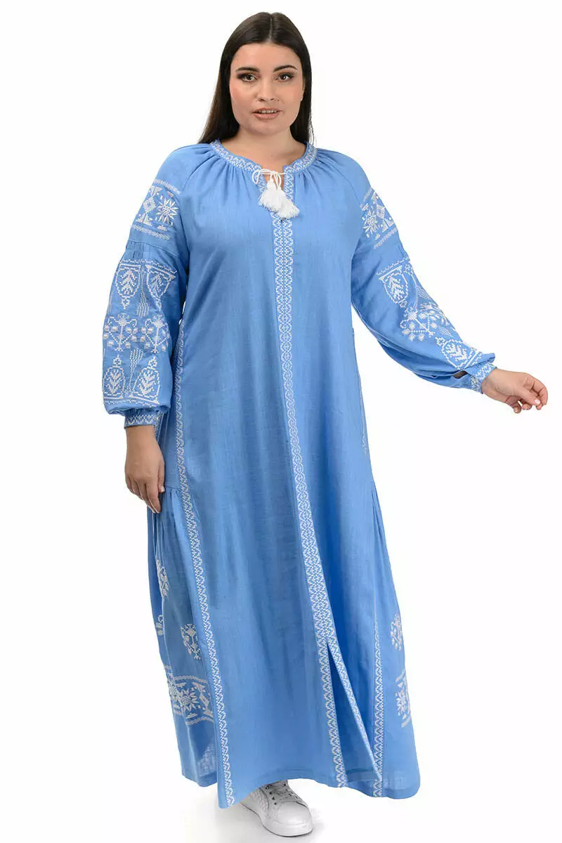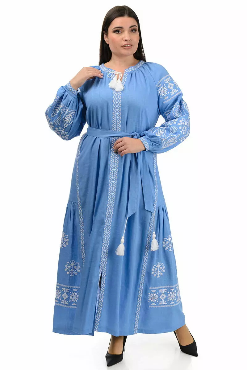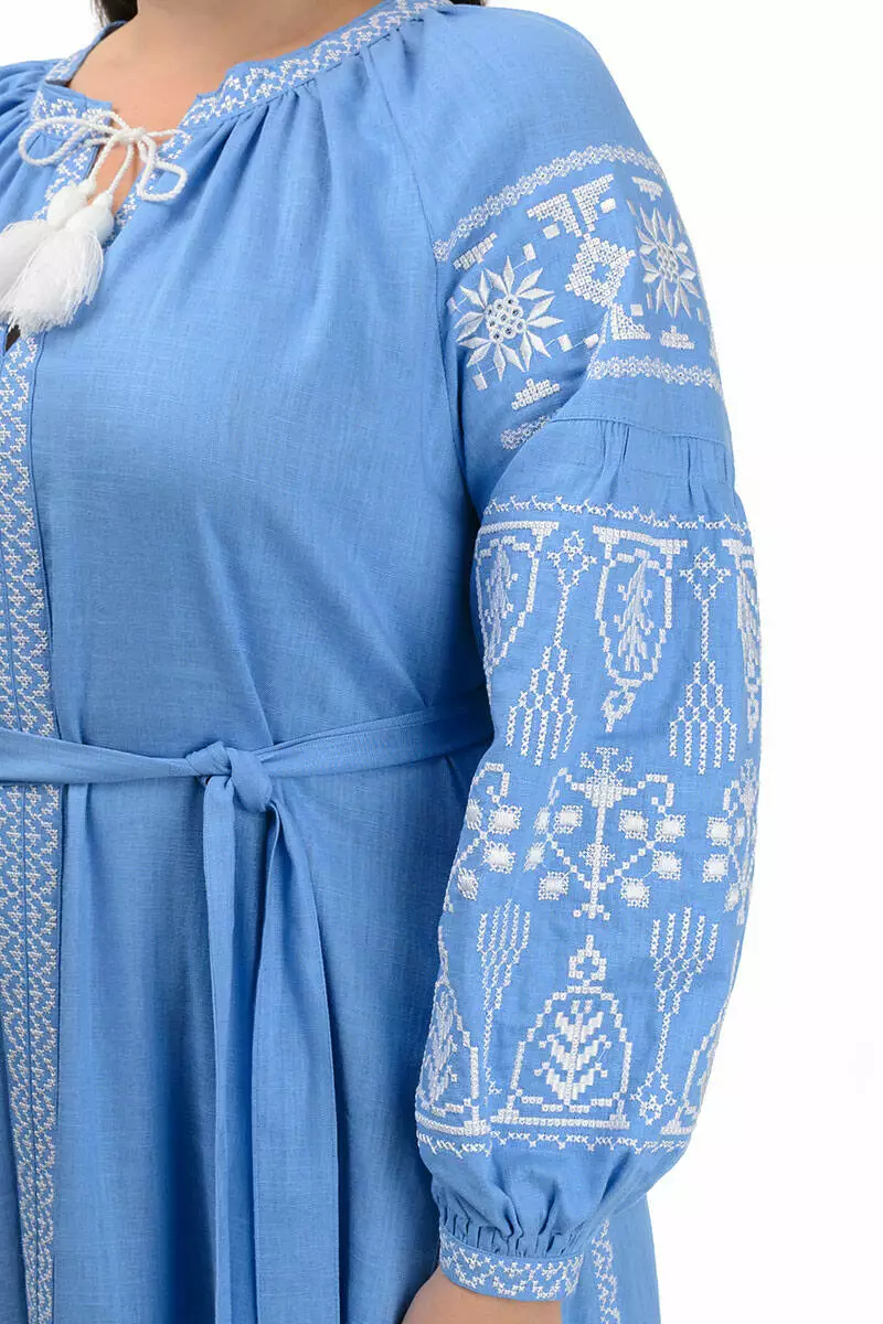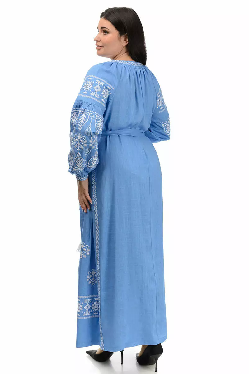Сукня-вишиванка вільного фасону, має об'ємні рукави, а також поясок для підкреслення талії.