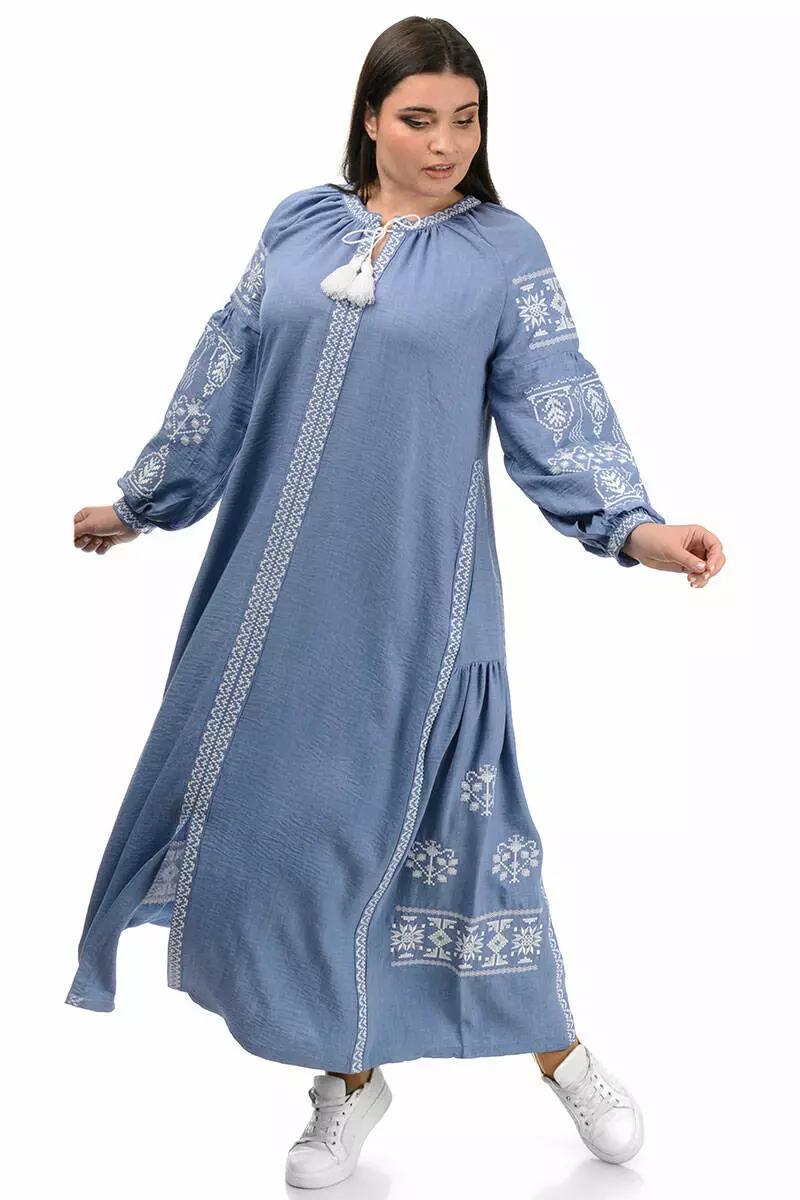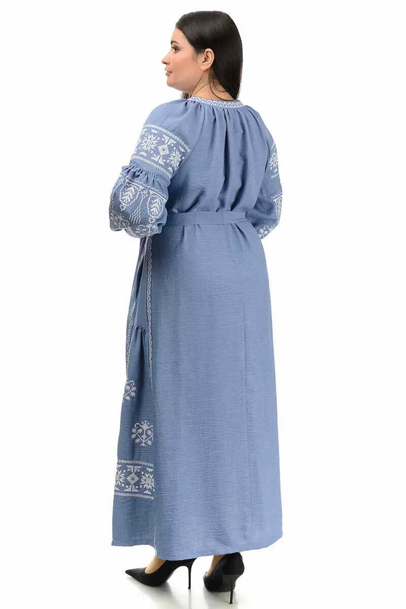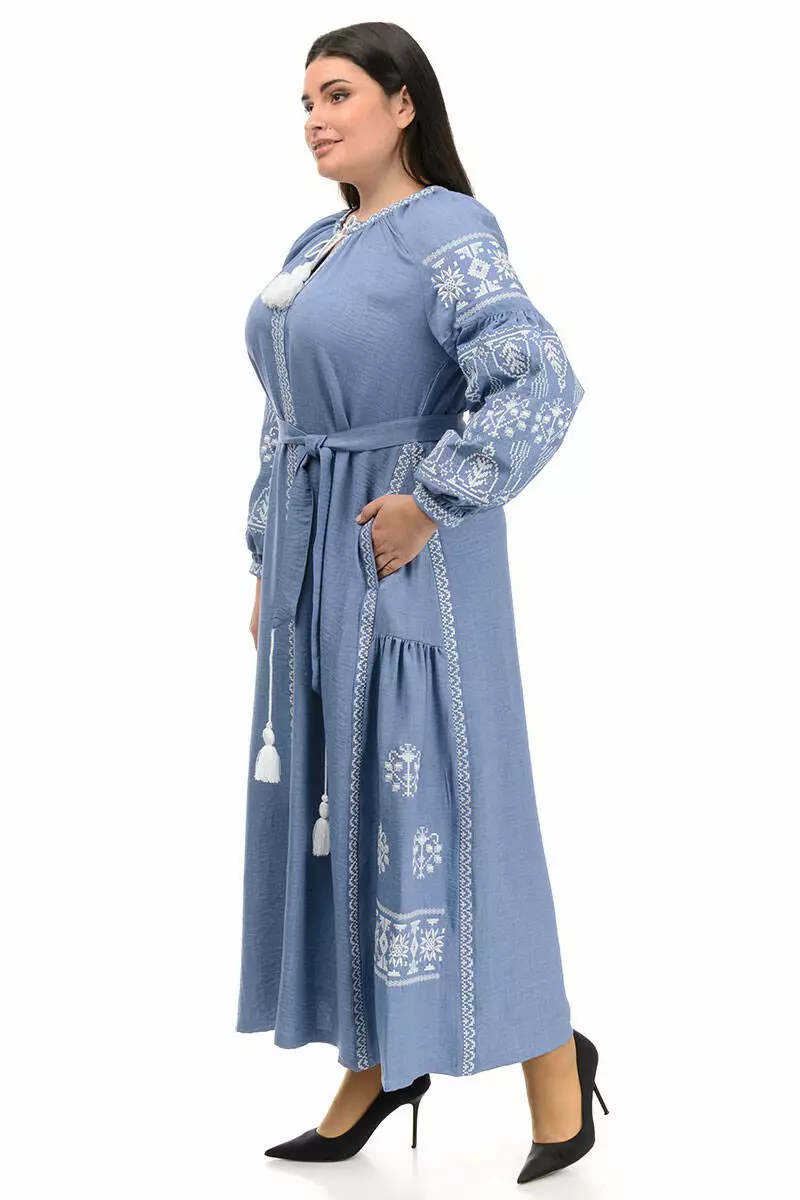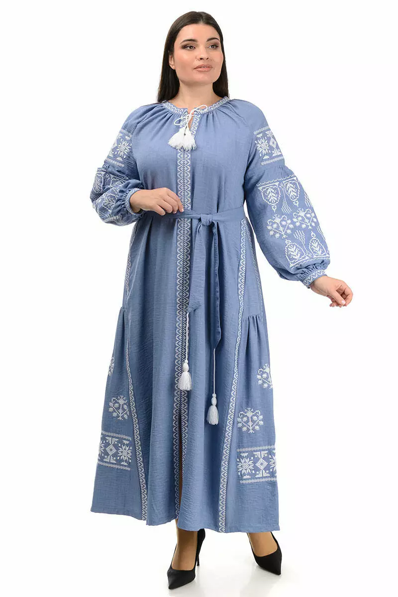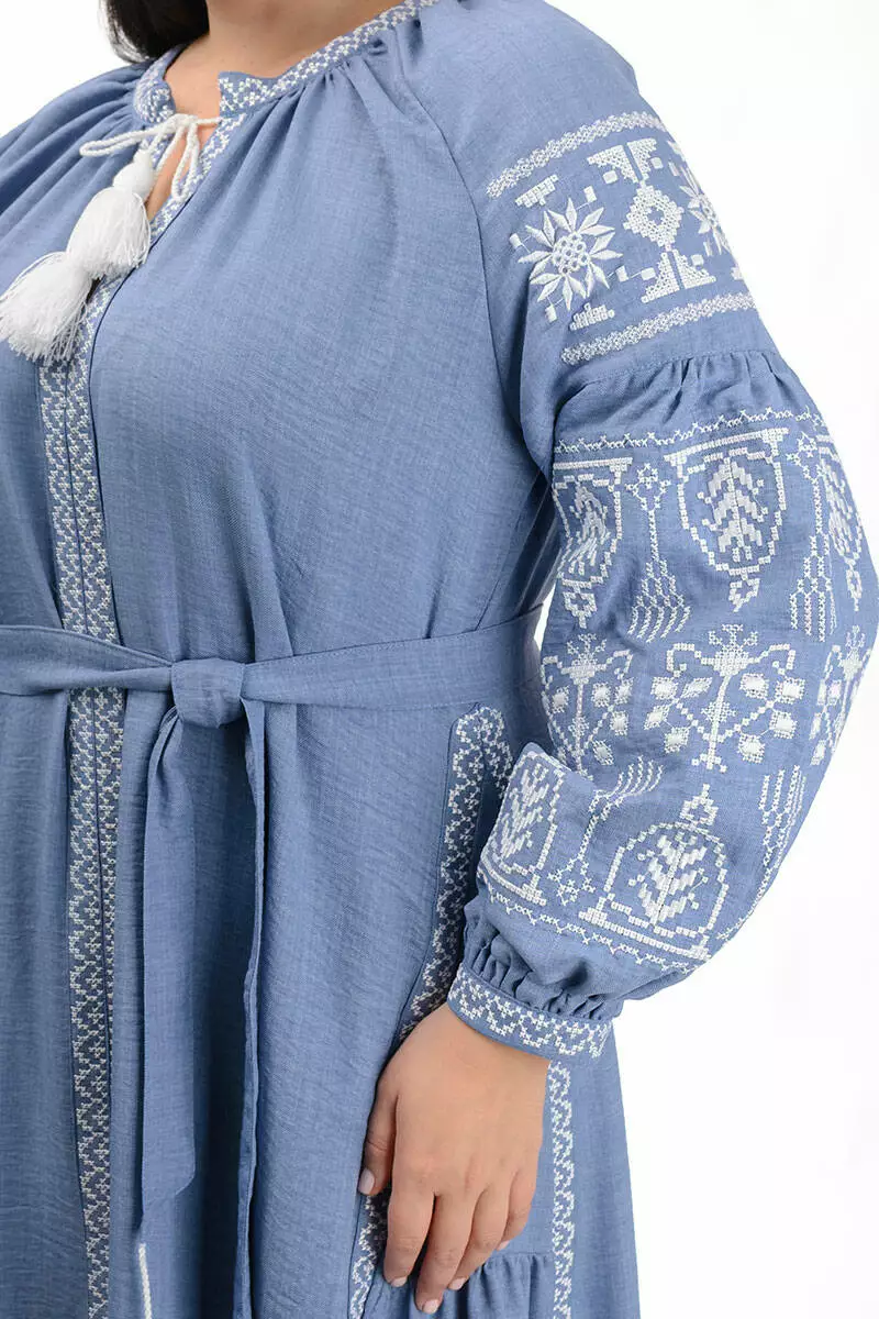 Сукня-вишиванка вільного фасону, має об'ємні рукави, а також поясок для підкреслення талії.