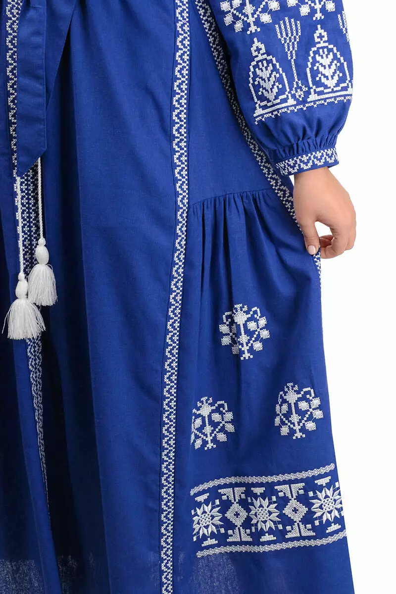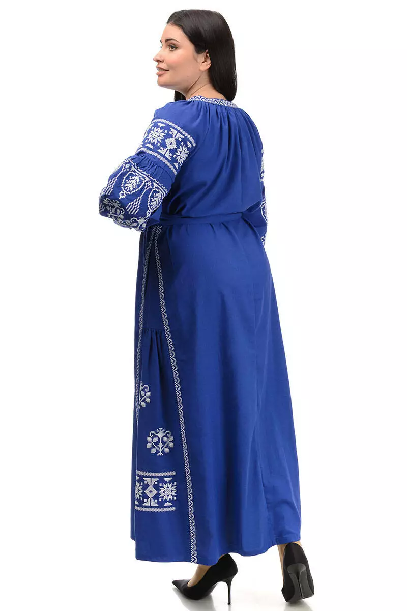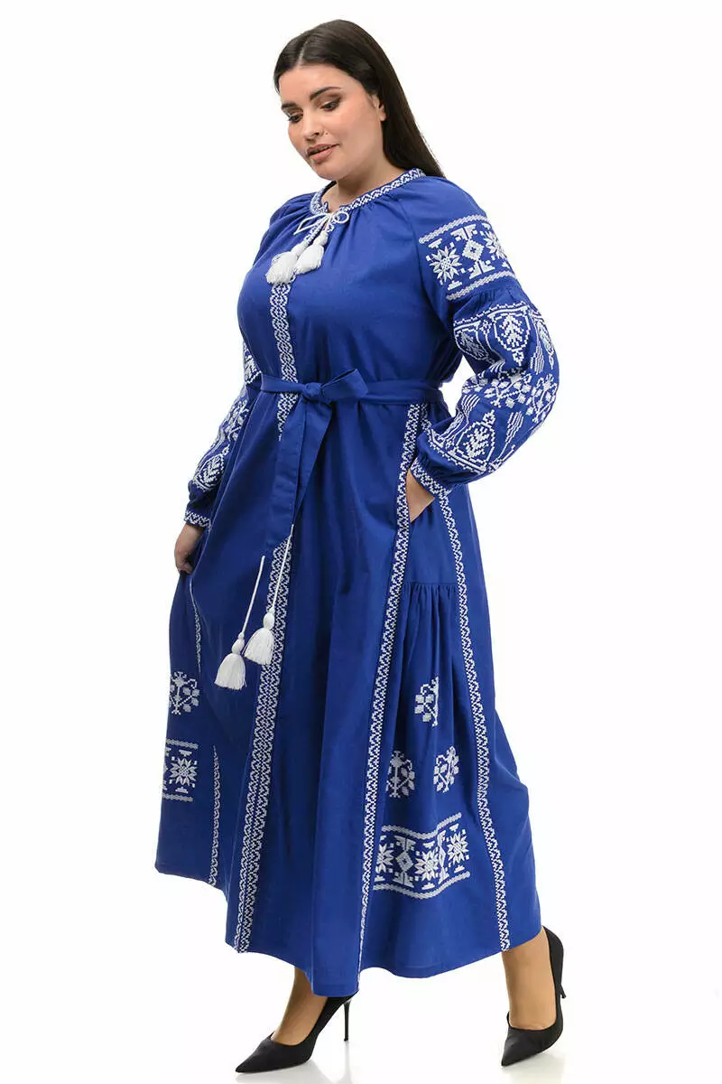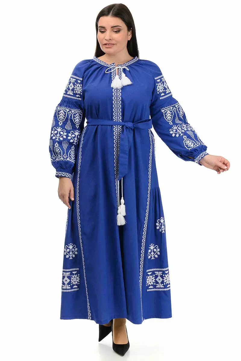 Сукня-вишиванка вільного фасону, має об'ємні рукави, а також поясок для підкреслення талії.