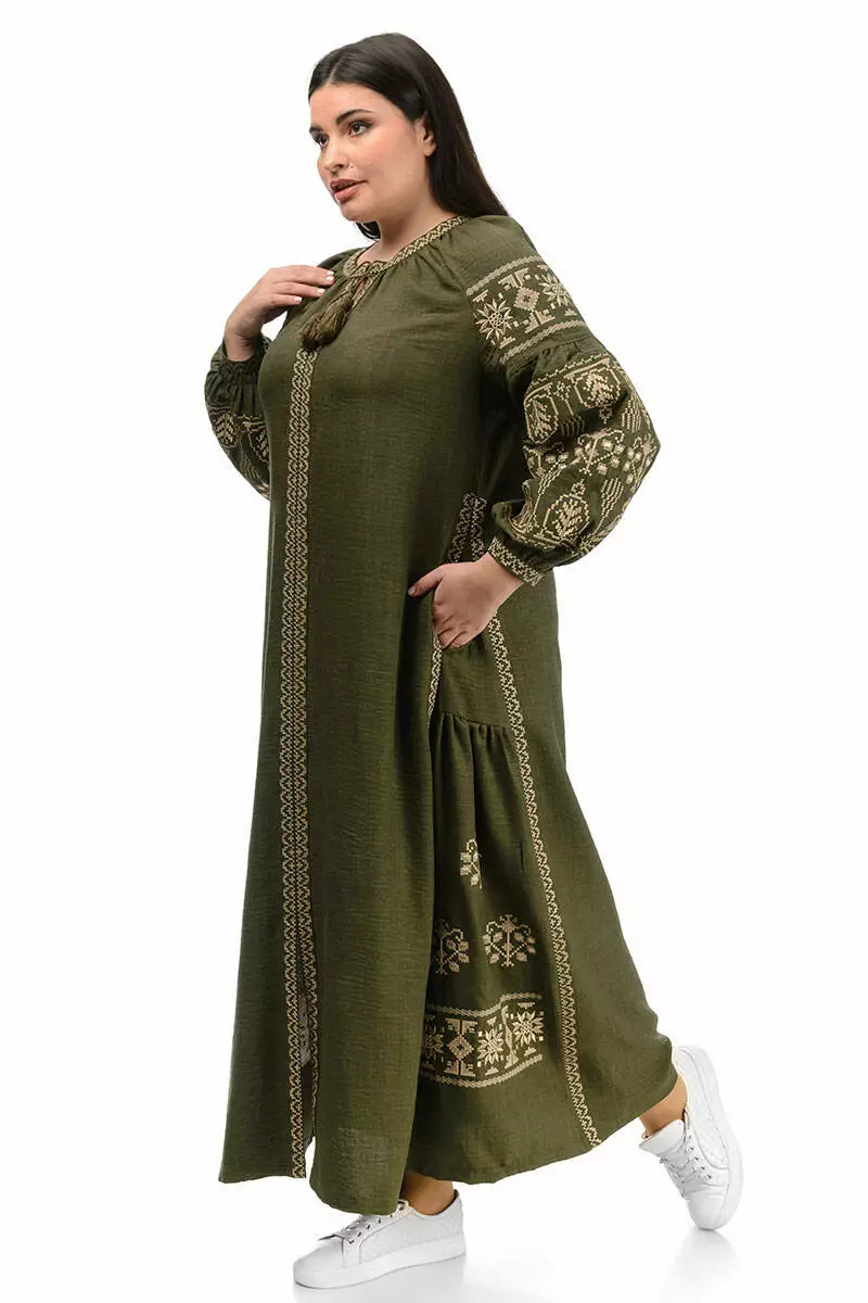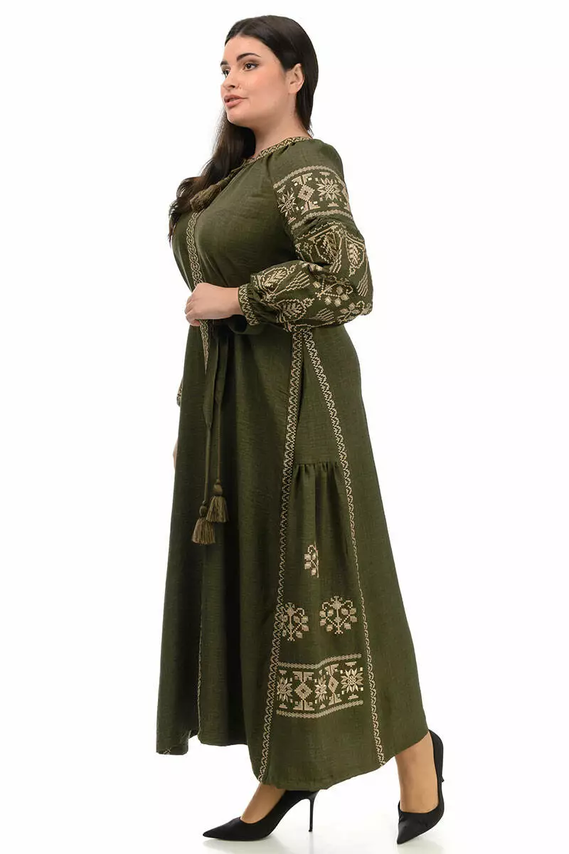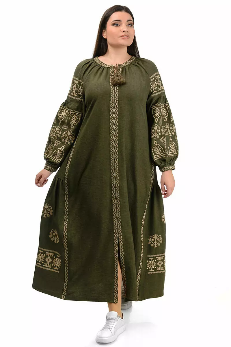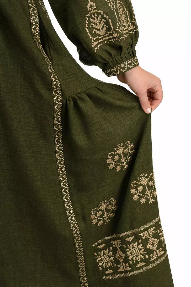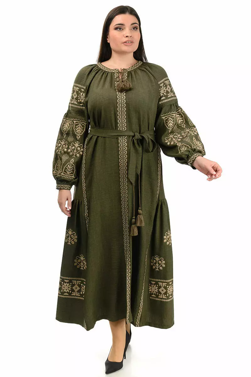 Сукня-вишиванка вільного фасону, має об'ємні рукави, а також поясок для підкреслення талії.
